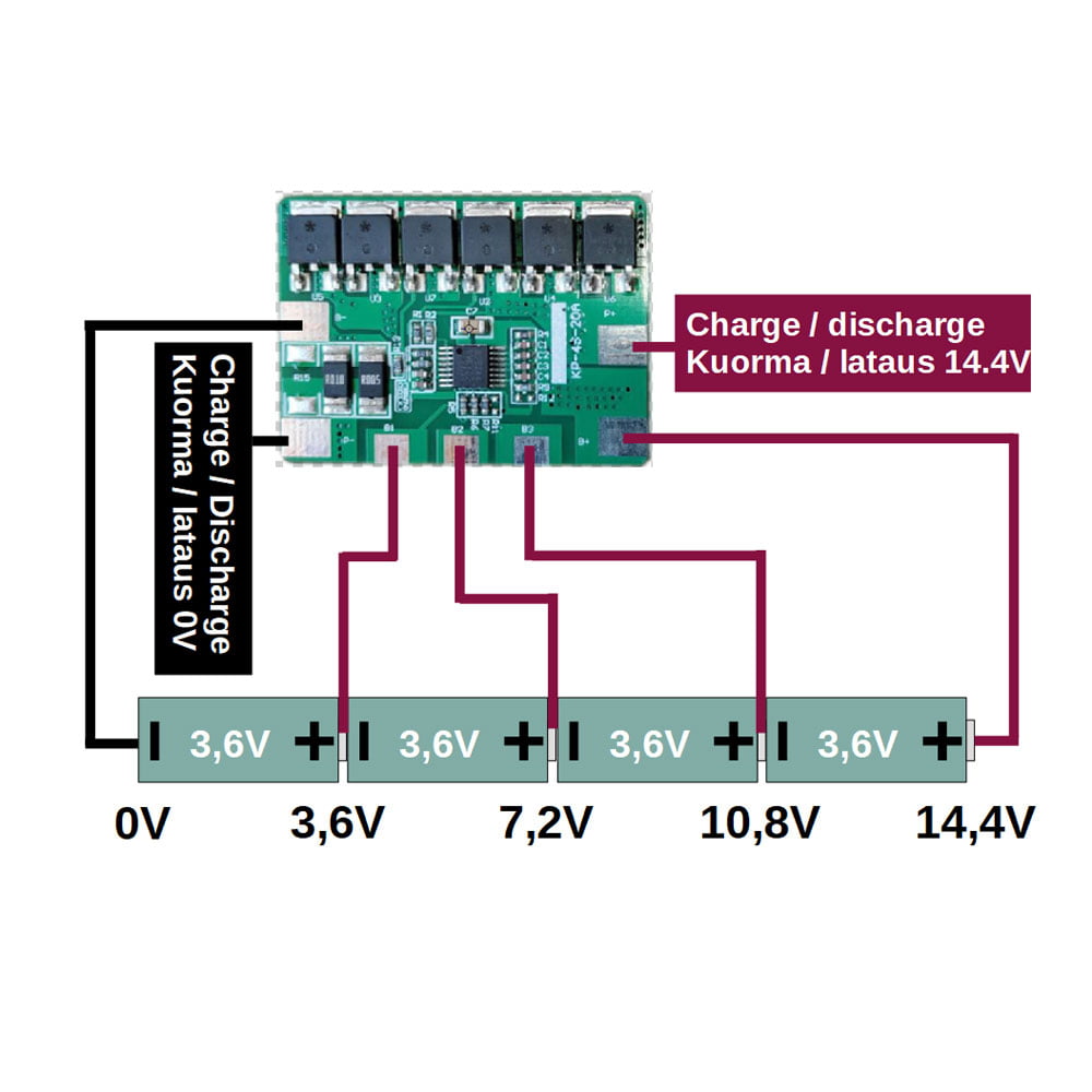 Laadukas ja kompaktin kokoinen elektroninen suojapiiri neljän 3,6 – 3,7 V li-ion akkukennon (tai kennoryhmän) sarjakytkennälle. Suojapiiri suojaa akkua ylijännitteeltä, alijännitteeltä, ylisuurelta purkuvirralta ja oikosululta.