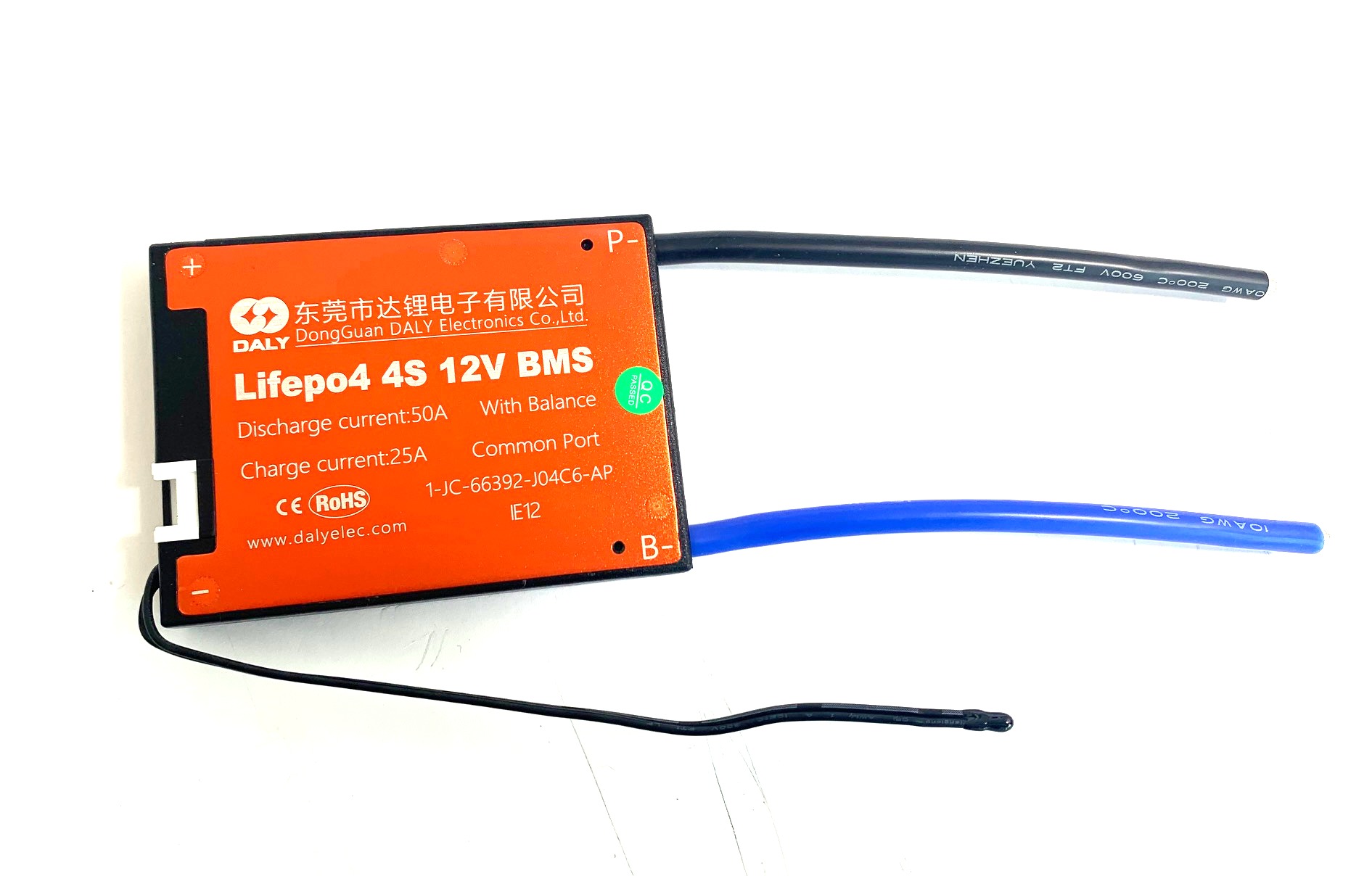 Laadukas, koteloitu Daly 4s LiFePO4 BMS akunhallintapiiri. Jatkuva purkuvirta max. 50 A, jatkuva latausvirta max. 25A.