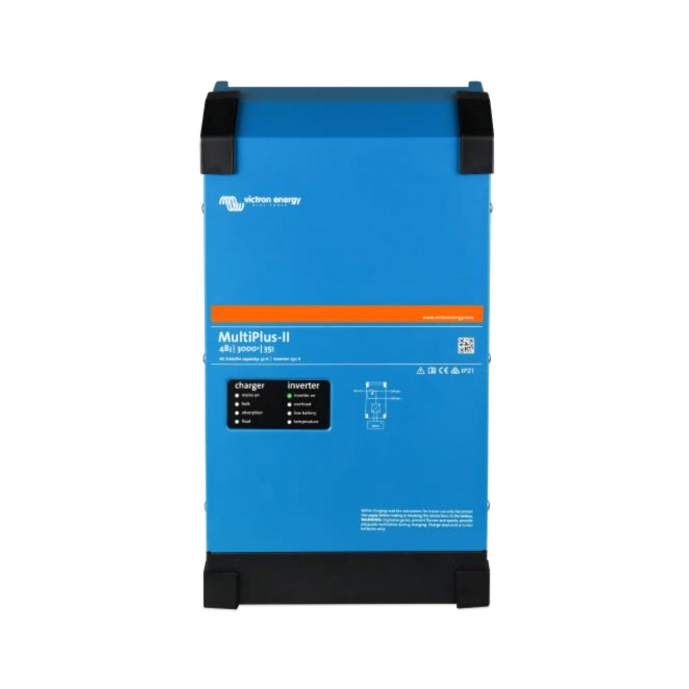 48V akun laturi max. 35A virralla. Invertterinä Multiplus II 48/3000 pystyy antamaan 230V jännitteellä 3000VA (2400W) tehoa jatkuvalla tahdilla (+25°C lämpötilassa). Piikkiteho on 5,5kW. Laitteen kuumetessa tehoa rajoitetaan. Katso tarkemmin datalehdestä. Jatkuva 3000VA teho vaatii akulta n. 70A purkuvirtaa ja huipputeho 5,5kW n. 120A akun purkuvirtaa. Sopivan akun saat esimerkiksi LiFePO4-akkukennoilla ja älykkäällä akunhallinnalla: 15-16 kpl EVE LF280K + 1 kpl JK B2A20S20P.